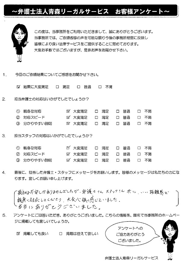 最初は不安しかありませんでしたが、弁護士さんスタッフさん共に、いい距離感で親身に対応してくださり、大変心強く感じていました。