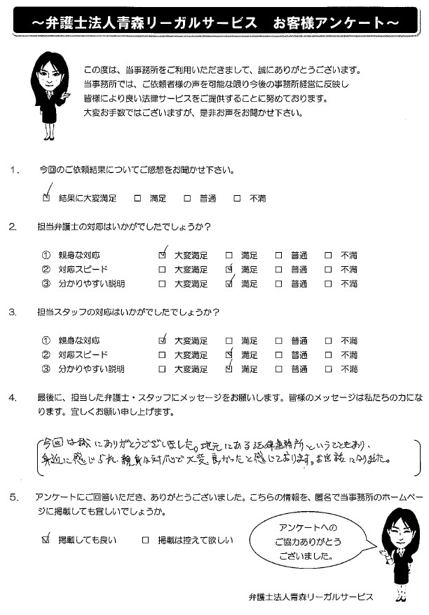 地元にある法律事務所ということもあり、身近に感じられ、親身な対応で大変良かったと感じております。